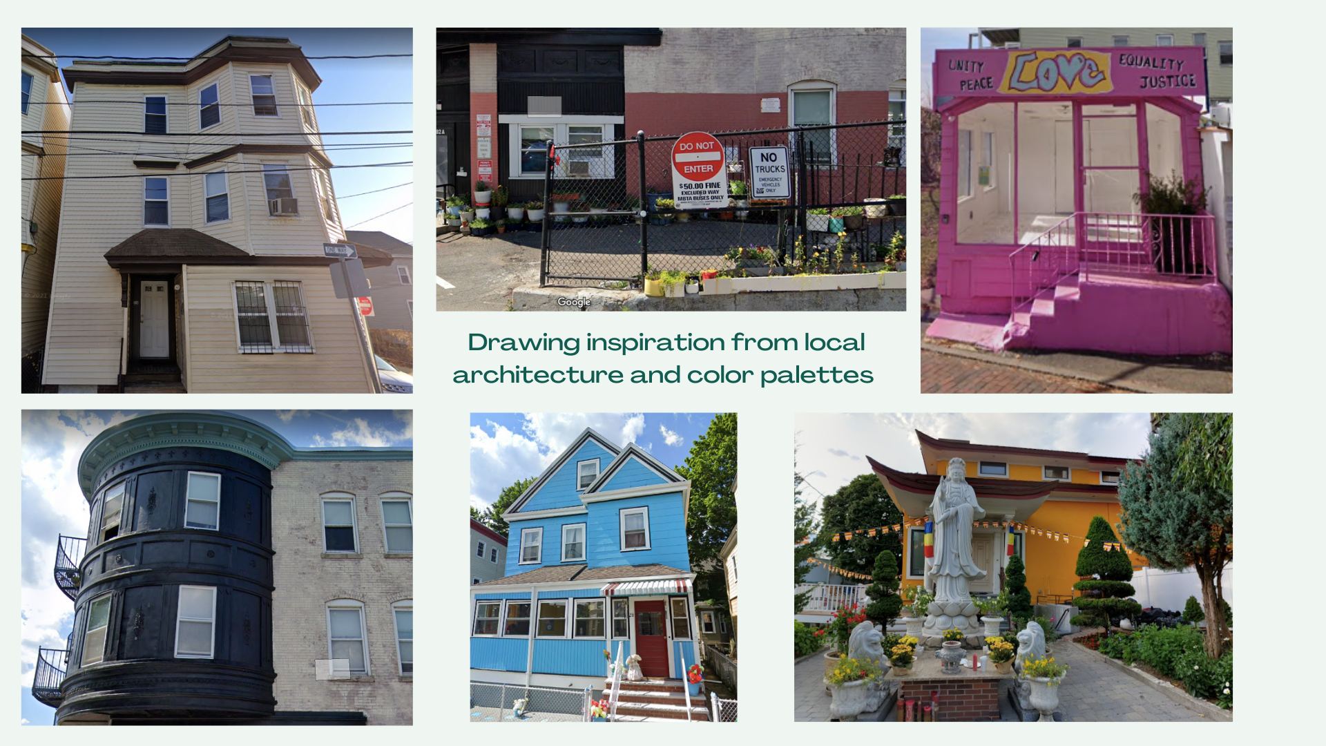 Colors are based on neighborhood architecture like the Buddhist Center for the bright yellow-orange and the nearby installation for the pink.