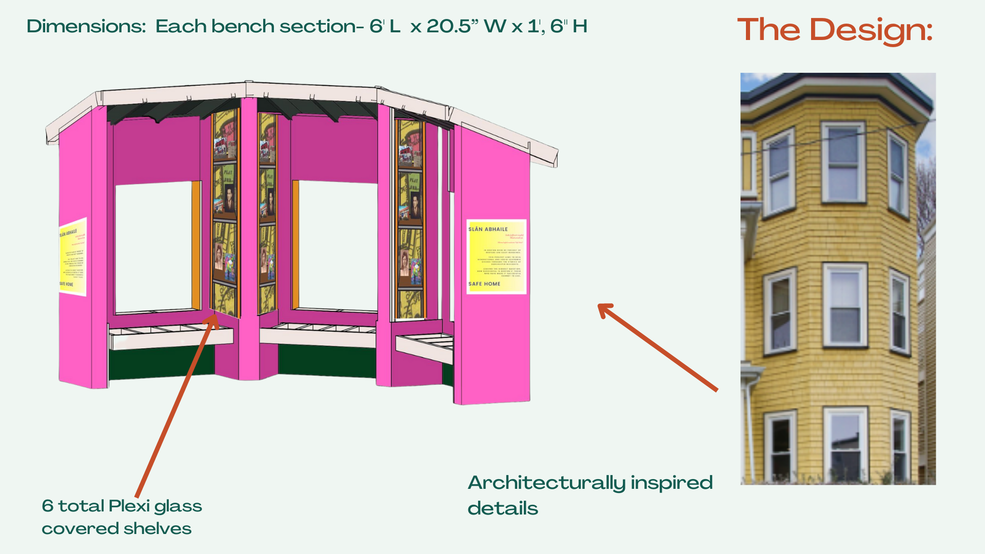 Six protected shelves on the sides of the bench will display community members' photographic interpretations of home.